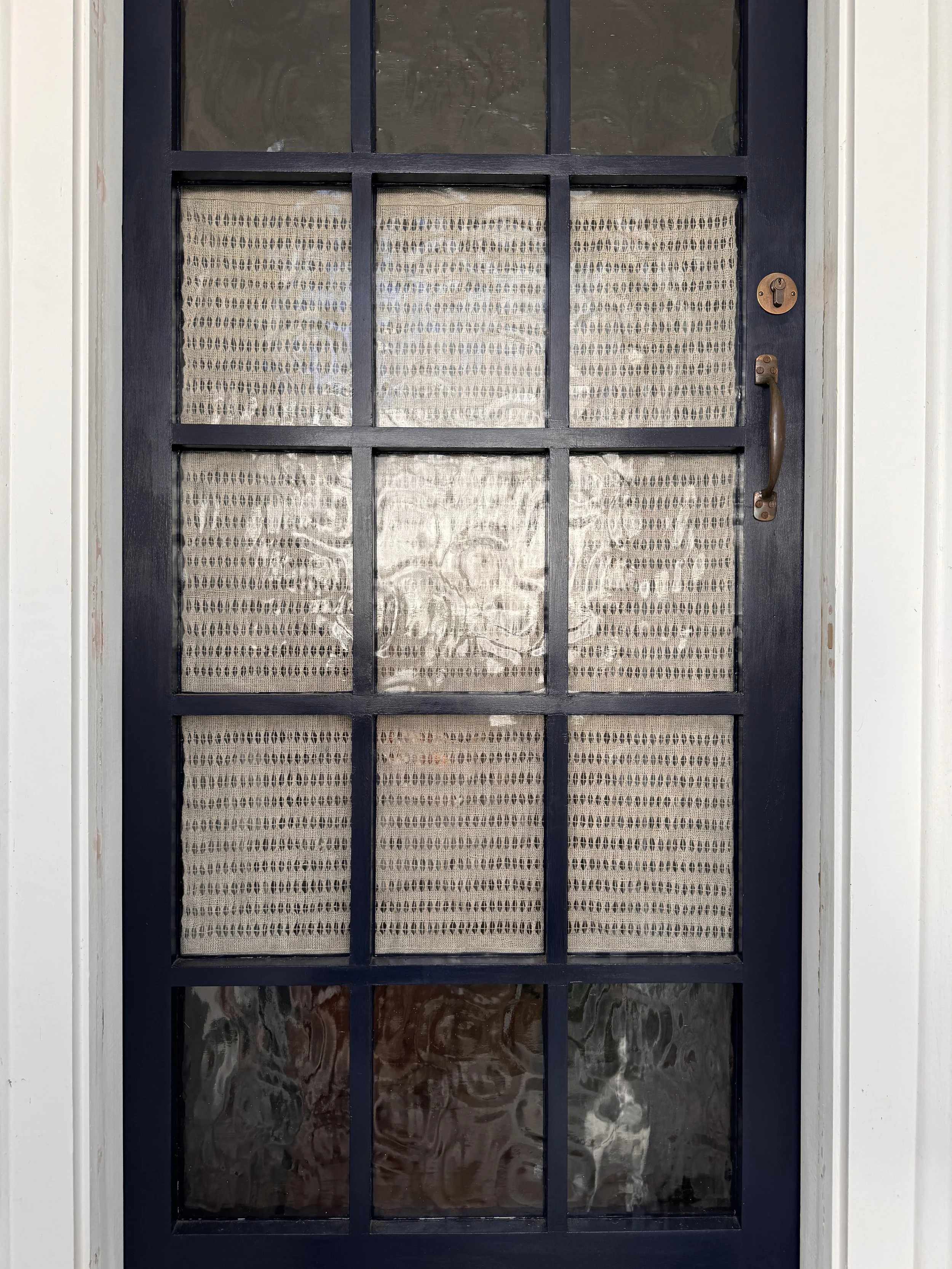 Precision woven to measure, adding privacy and enhancing visual interest to restored glass paned front entry door
